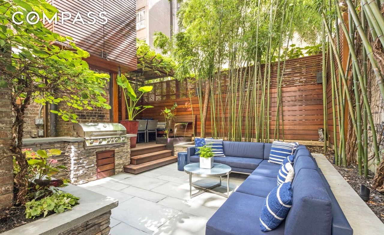 A sophisticated outdoor kitchen and lounge area seamlessly blending culinary functionality with resort-style relaxation. Anchored by a built-in stone grill counter and flanked by tall bamboo screening, the space features a curved blue sectional sofa, minimalist round cocktail table, and pergola-shaded dining zone, all unified by warm stone pavers and natural wood accents that evoke organic modern design with coastal influences.