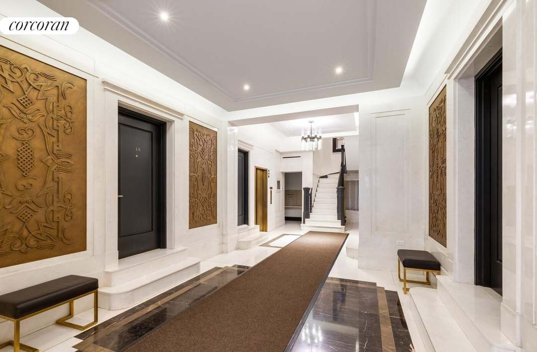 A sophisticated residential hallway featuring striking bronze relief art panels flanking black lacquered doors, pristine white walls with crown molding, and polished marble flooring with bronze inlay strips. The tray ceiling with recessed lighting and understated brass hardware creates an elegant, gallery-like passage befitting a luxury residential building or high-end penthouse.