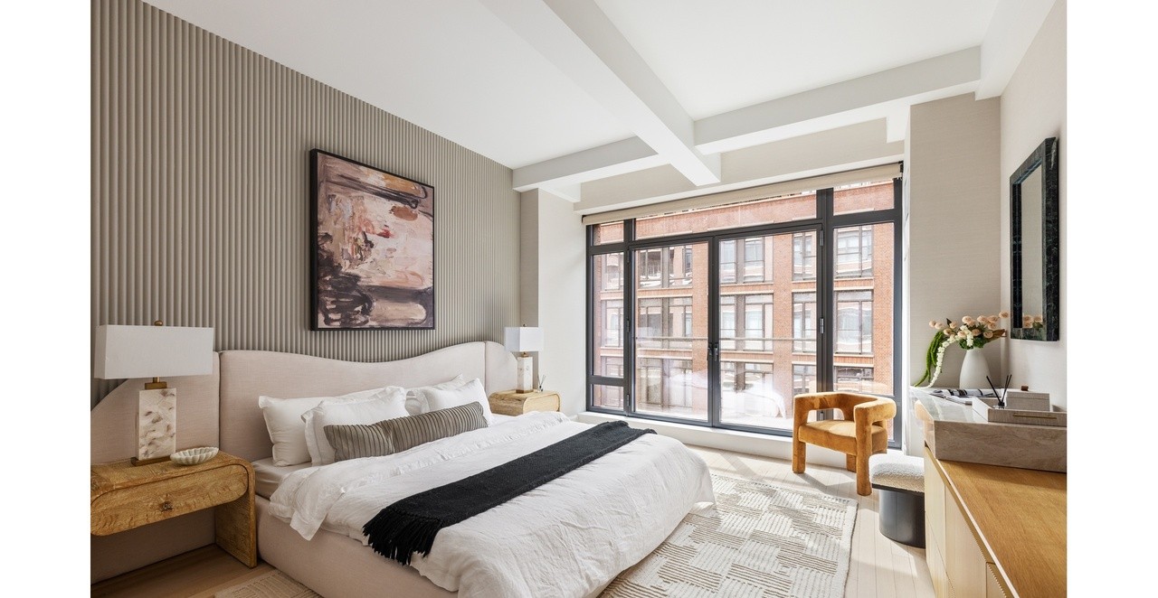 A serene primary bedroom featuring a soft, neutral palette anchored by vertical striped wall paneling and a coffered ceiling with integrated skylights. Floor-to-ceiling black-framed windows flood the space with natural light, while curated furnishings in warm wood tones and creams create a sophisticated, calming retreat with subtle luxury details.