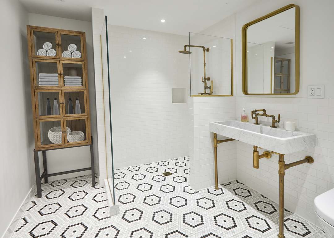 A serene, contemporary primary bathroom featuring a striking hexagonal patterned floor in black and white, paired with clean white subway tile walls and a sculptural marble double vanity with brass fixtures. The design balances luxury materials with understated elegance, highlighted by a frameless walk-in shower and curated storage cabinetry, creating a spa-like retreat that feels both sophisticated and inviting.