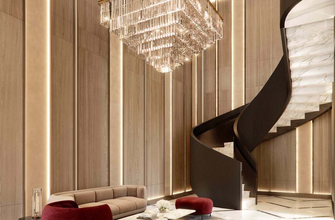 A stunning modern entryway defined by soaring wood-paneled walls with integrated brass linear lighting that creates a warm, luminous backdrop for a sculptural black spiral staircase. The space balances architectural drama with refined furnishings—a curved cream sectional and burgundy ottoman—beneath an ornate tiered crystal chandelier, achieving a sophisticated blend of contemporary architecture and luxury hospitality design.