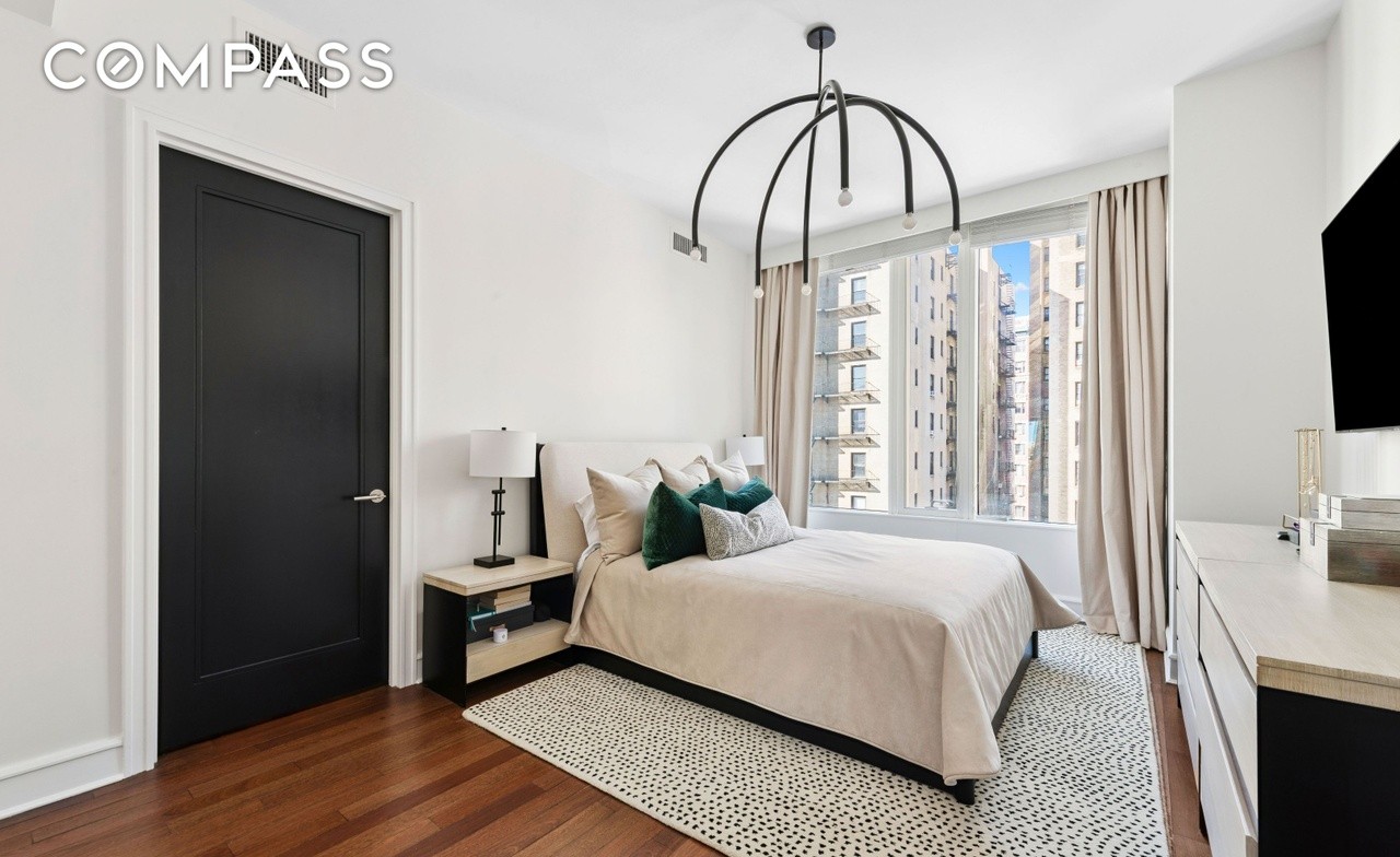 A serene primary bedroom featuring floor-to-ceiling city views, warm neutral palette with sophisticated accents of black and deep green, and a striking sculptural black pendant light fixture. The space balances modern furnishings with classic architectural details like crown molding and hardwood flooring, creating a calming yet refined urban retreat.