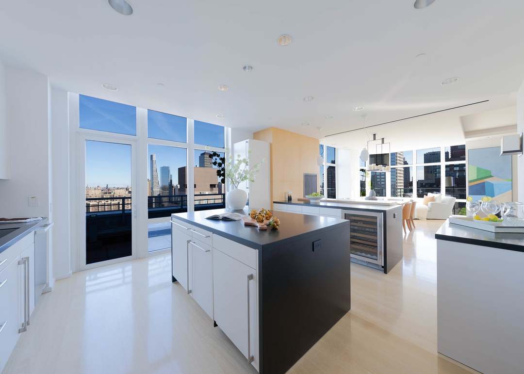 A stunning high-rise kitchen featuring pristine white cabinetry, a dramatic black waterfall-edge island with quartz countertops, and soaring floor-to-ceiling windows showcasing expansive city skyline views. The open-concept layout merges seamlessly with the adjoining living spaces, defined by polished marble flooring, clean modernist lines, and an abundance of natural light that elevates this space to editorial-worthy luxury.
