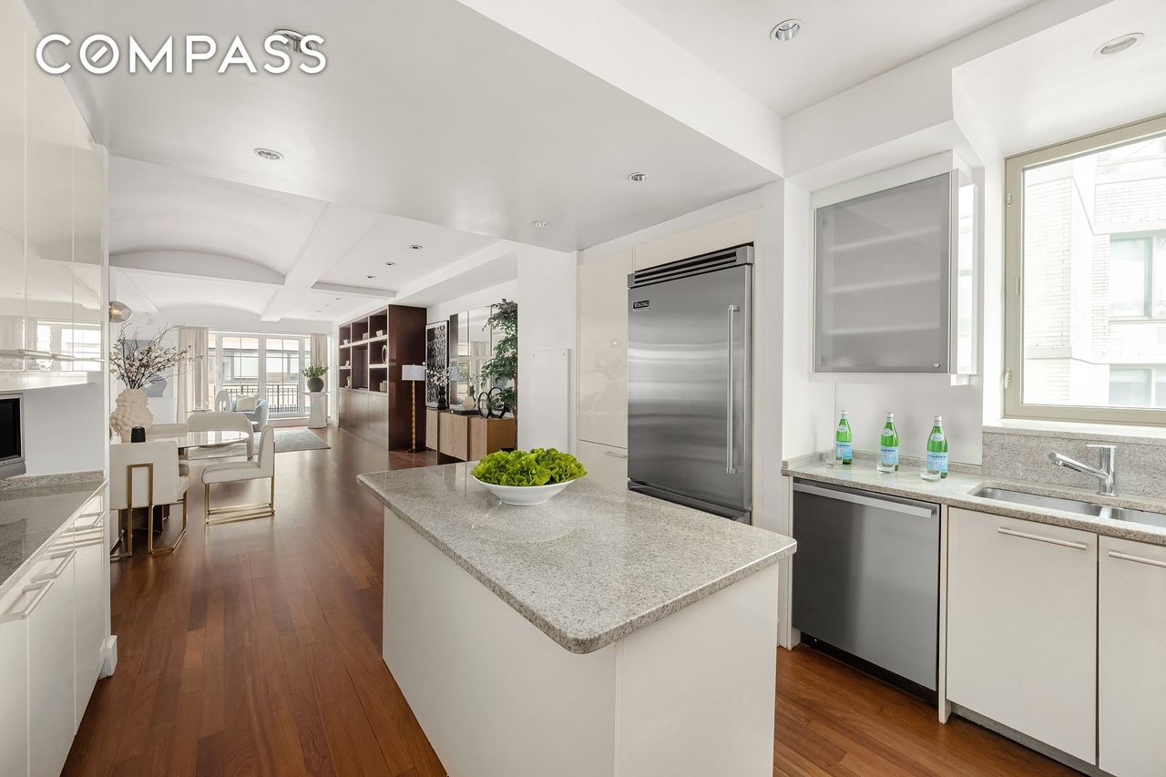 Countertop: QuartzCabinets: Flat Panel, Two ToneCabinet Color: White And Dark WoodFlooring: HardwoodCeiling: Coffered