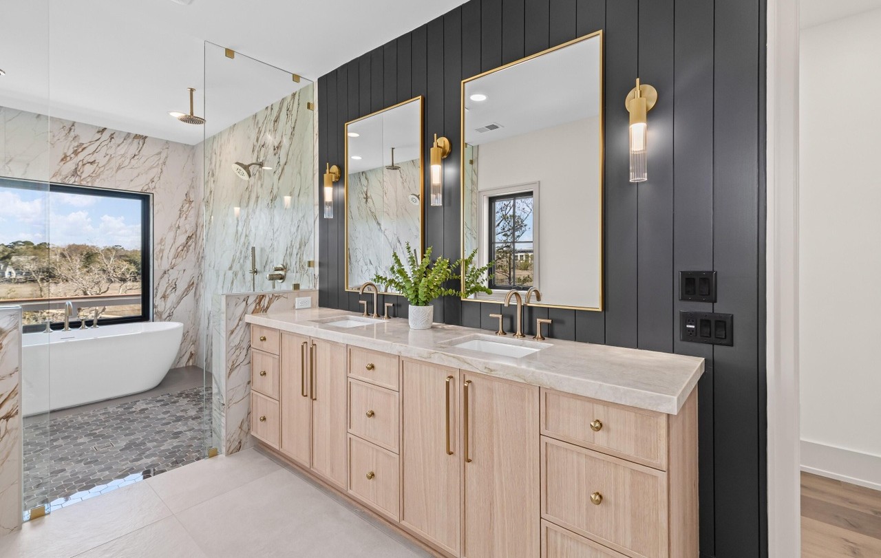 A stunning primary bathroom featuring a dual-vanity layout with marble countertops and light wood cabinetry, anchored by a dramatic charcoal board-and-batten accent wall and complemented by brass hardware and statement pendant lighting. The spa-like space seamlessly blends a luxurious freestanding soaking tub with a spacious frameless glass walk-in shower, flooded with natural light from expansive windows overlooking scenic landscape views.