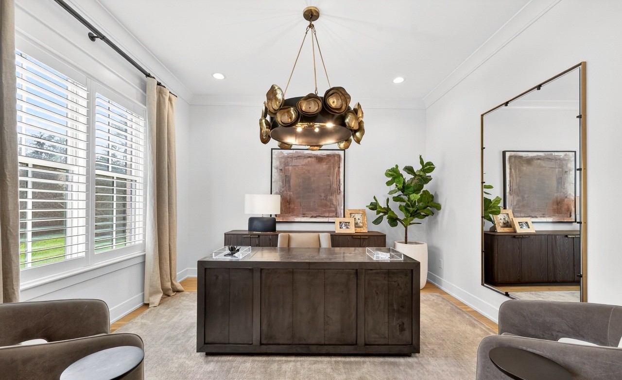 A sophisticated home office featuring a sculptural brass chandelier with statement pendant details suspended above a dark stained wood desk, accented with wainscoting and crown molding that blend traditional architectural elements with contemporary glam finishes. The space is flooded with natural light from floor-to-ceiling shuttered windows, elevated by a large brass-framed mirror and layered with elegant furnishings including curved lounge chairs and a thriving potted plant for organic warmth.
