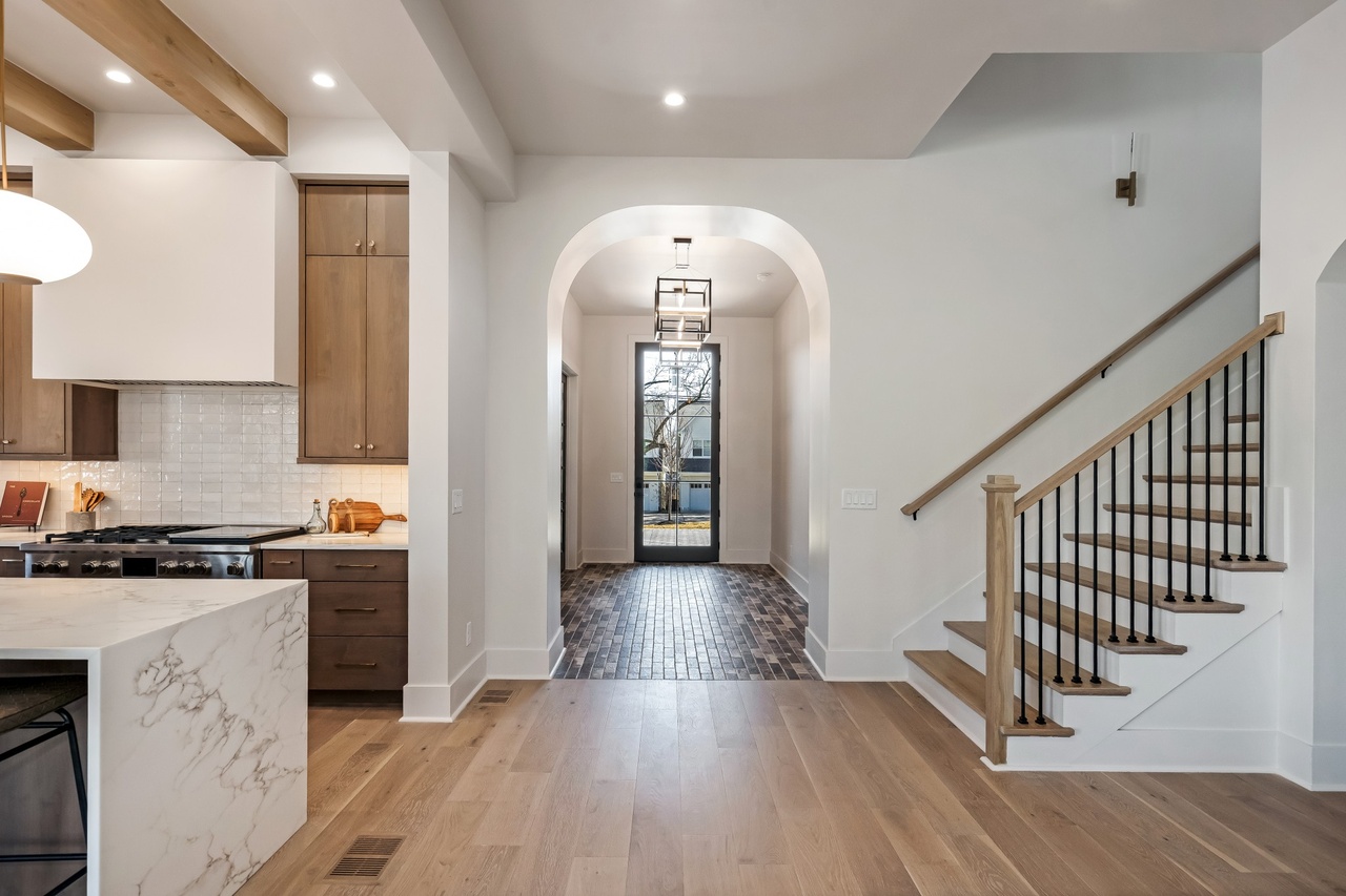 This sophisticated transitional entryway seamlessly connects a luxury kitchen to a grand foyer and staircase, defined by an elegant arched passageway and distinctive architectural details. The warm wood tones, marble waterfall island, subway tile backsplash, and modern black steel stair railing create a balanced blend of traditional molding and contemporary minimalism, bathed in abundant natural light from the arched glass entry door.