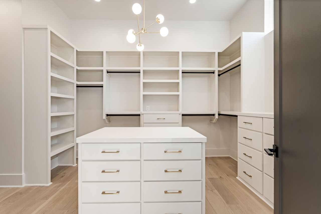 A sophisticated walk-in closet featuring custom white cabinetry, open shelving, and a central quartz-topped island with brass hardware, all bathed in warm ambient lighting from a modern chandelier. The design masterfully combines organizational functionality with luxury finishes, creating a serene dressing sanctuary with abundant storage and display options.