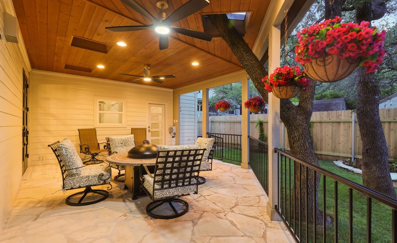 A sophisticated covered patio seamlessly blends indoor and outdoor living with warm wood plank ceilings, cream shiplap walls, and natural stone flooring. The space is anchored by a central firepit surrounded by comfortable upholstered seating and elevated by abundant hanging red flowers, professional lighting, and refined metal railings that create an inviting luxury retreat.