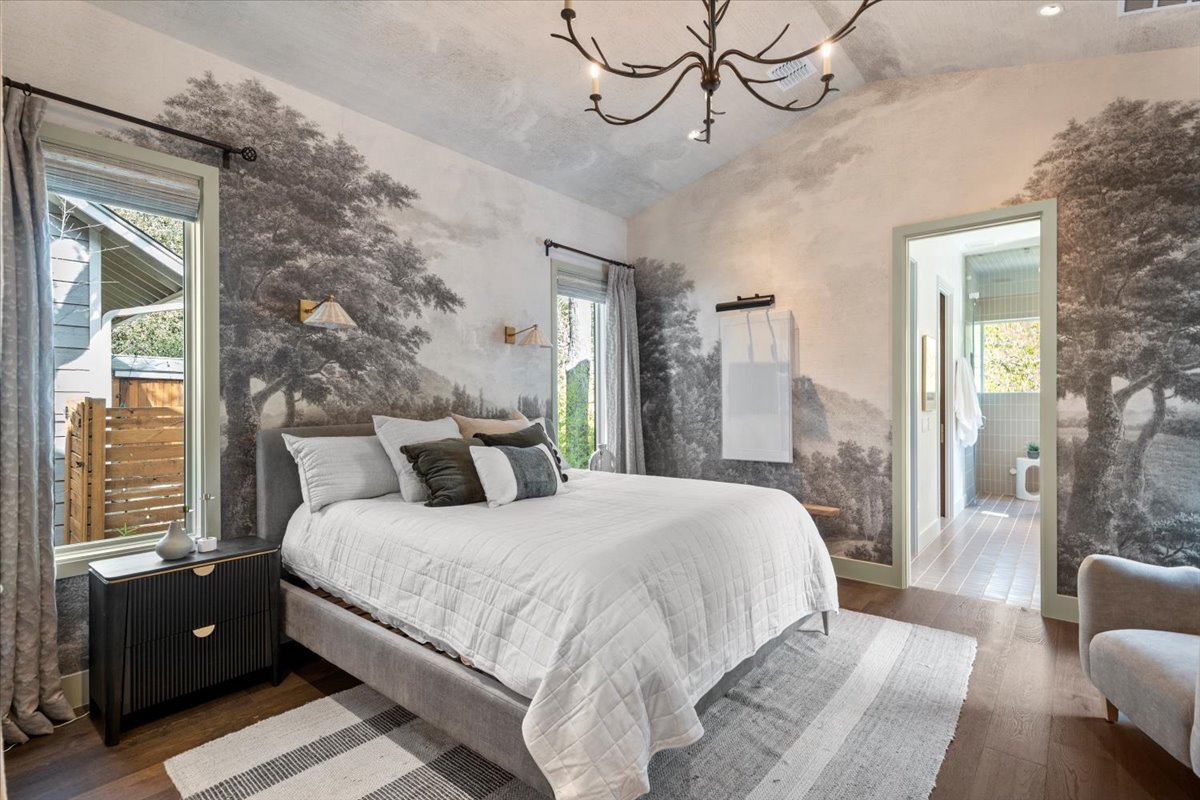 A serene primary bedroom featuring an expansive nature-inspired wallpaper mural that spans all walls, creating a forest landscape atmosphere with sophisticated gray and taupe tones. The space balances architectural elegance with organic warmth through mixed materials—hardwood flooring, linen curtains, and a restrained color palette—while large windows and outdoor access provide abundant natural light and visual continuity with the surrounding landscape.