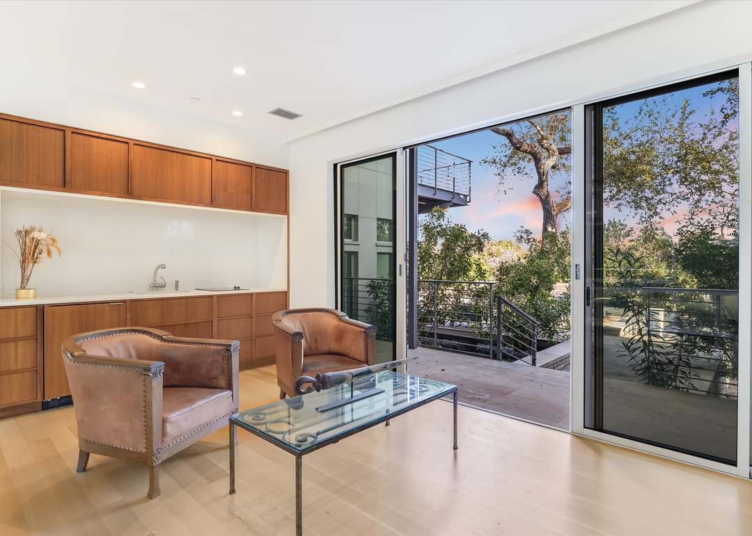 A sophisticated open-concept living room seamlessly integrated with built-in custom millwork featuring warm natural wood cabinetry and white walls. Expansive floor-to-ceiling sliding glass doors flood the space with abundant natural light and frame scenic tree-line views, creating a serene yet luxurious retreat with refined leather furnishings and minimalist design sensibility.