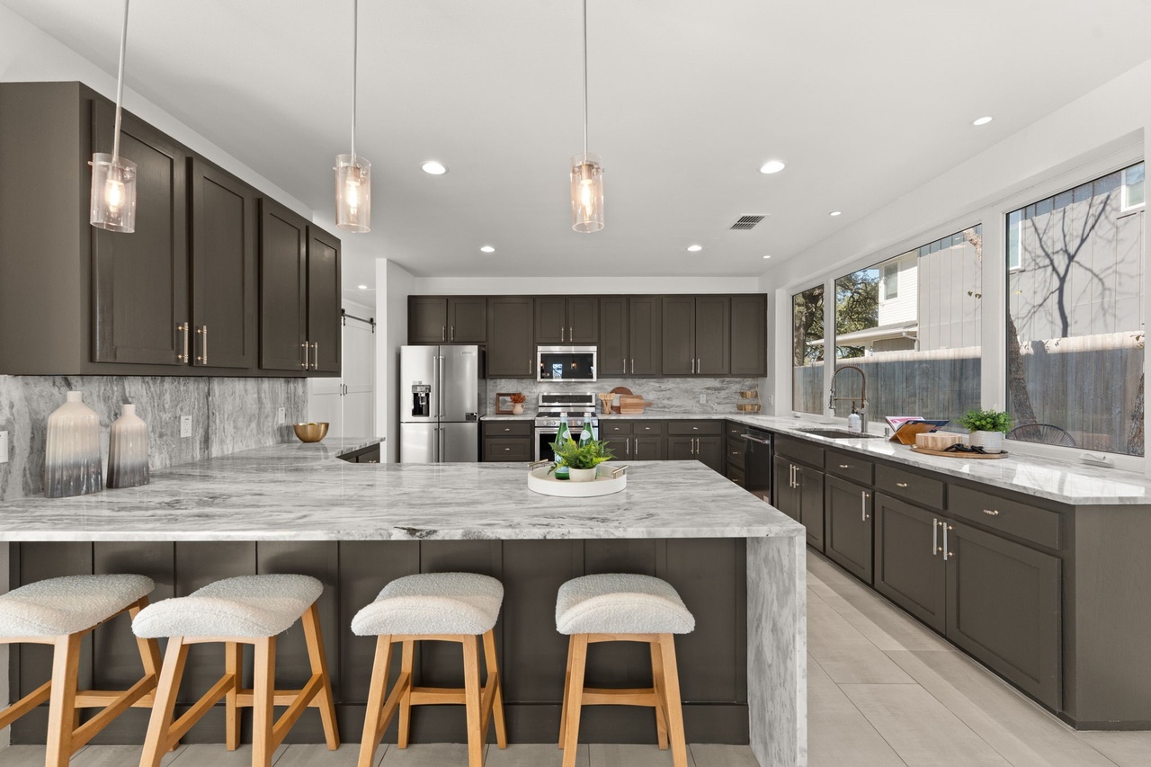 A stunning contemporary kitchen featuring a dramatic charcoal gray cabinetry paired with elegant white marble countertops and a gray stone backsplash, anchored by a generous waterfall-edge island with seating for four. Abundant natural light floods through expansive windows, complemented by sophisticated pendant lighting and recessed fixtures, creating a sophisticated yet inviting space with clean lines and premium finishes.