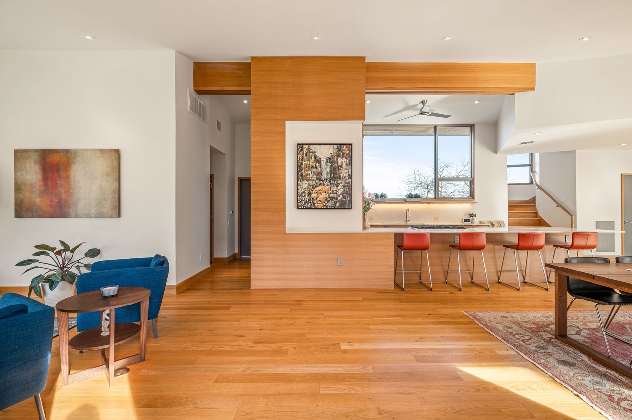 This stunning open-concept living and kitchen space showcases organic modern design with warm wood tones, abundant natural light, and sophisticated material layering. A sculptural wood beam structure visually separates the kitchen island with coral bar seating from the living area, while large windows, high ceilings, and a carefully curated palette of natural materials create an airy yet warm luxury environment.