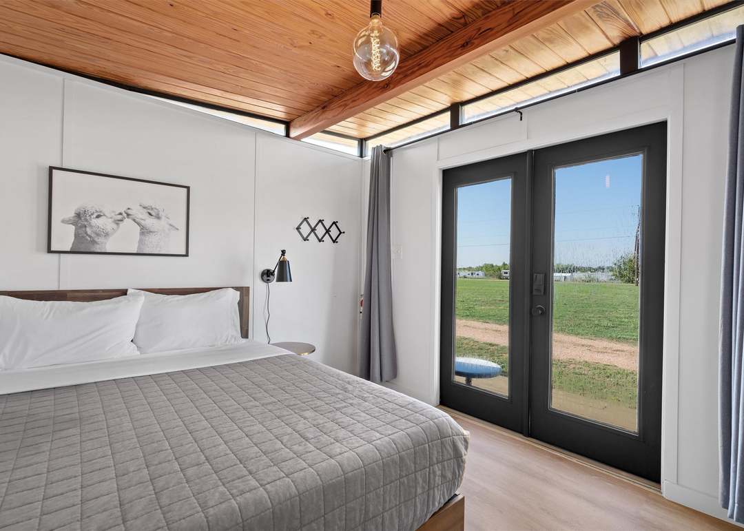 A serene primary bedroom exemplifying organic modern design with a warm wood plank ceiling and expansive floor-to-ceiling black-framed glass doors opening onto rural landscape views. The space balances minimalist furnishings and neutral palette with natural materials and abundant natural light, creating an airy, sophisticated retreat.