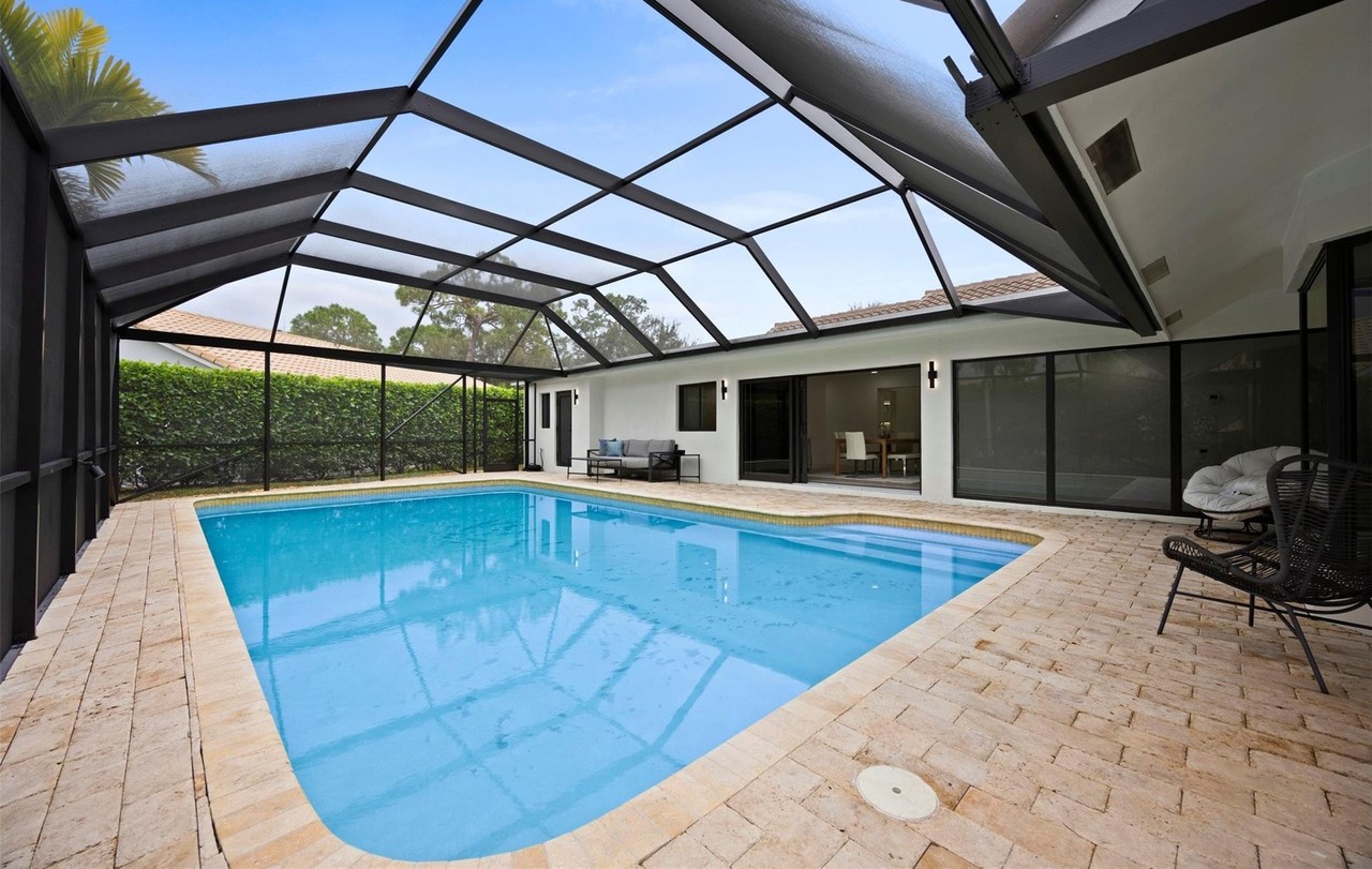 A professionally designed residential pool area enclosed by a striking black aluminum pergola with polycarbonate/glass panels, creating a bright, climate-controlled outdoor living space. The composition seamlessly integrates a pristine rectangular pool, clay tile decking, modern lounge seating, and a contemporary white residence with floor-to-ceiling glass doors, exemplifying luxury tropical-contemporary design with excellent functionality and visual refinement.