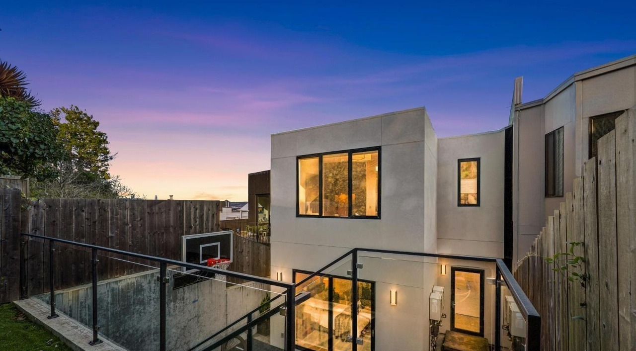 A sleek modern patio with clean-lined black steel railings, multi-level concrete decking, and expansive floor-to-ceiling windows revealing an illuminated minimalist interior. The space exemplifies contemporary desert modern design with warm interior lighting contrasting against the cool twilight sky and cool-toned exterior finishes.