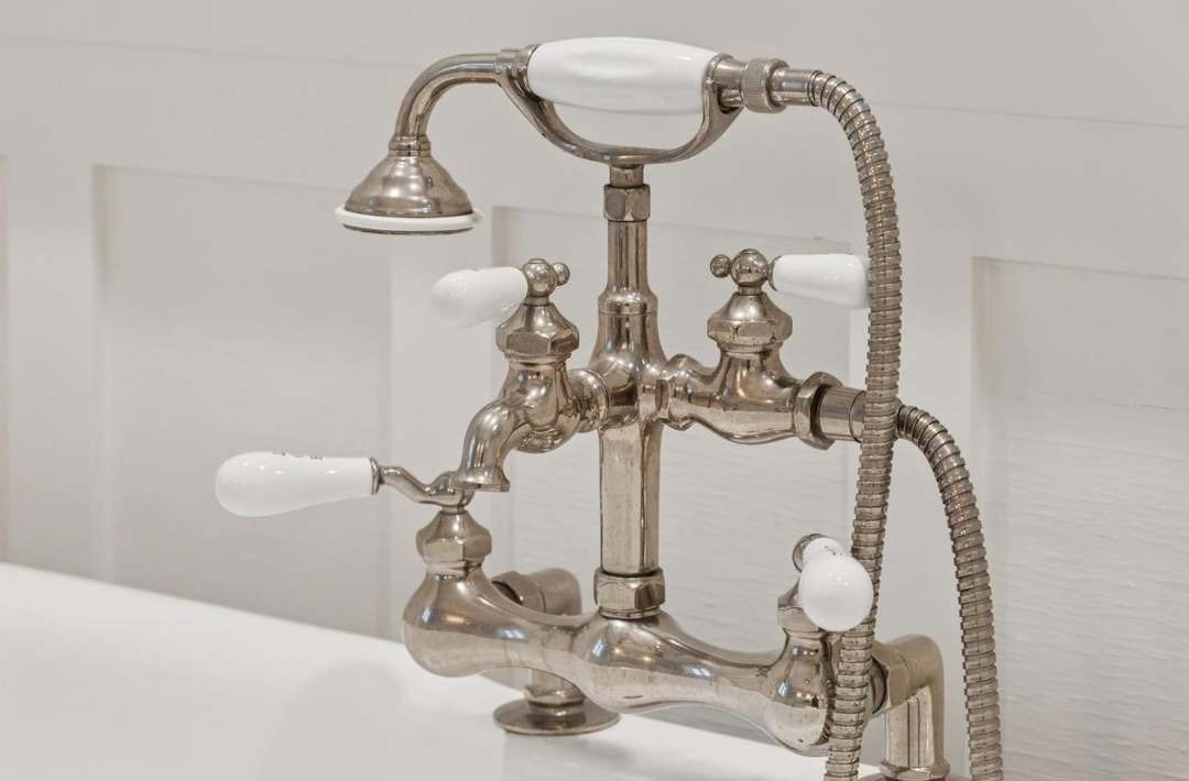 An elegantly appointed primary bathroom featuring a vintage-inspired polished brass clawfoot tub filler with hand-held shower, porcelain lever handles, and architectural showerhead. The timeless design blends old-world luxury with refined craftsmanship, creating a sophisticated spa-like retreat with warm metallic accents against neutral walls.