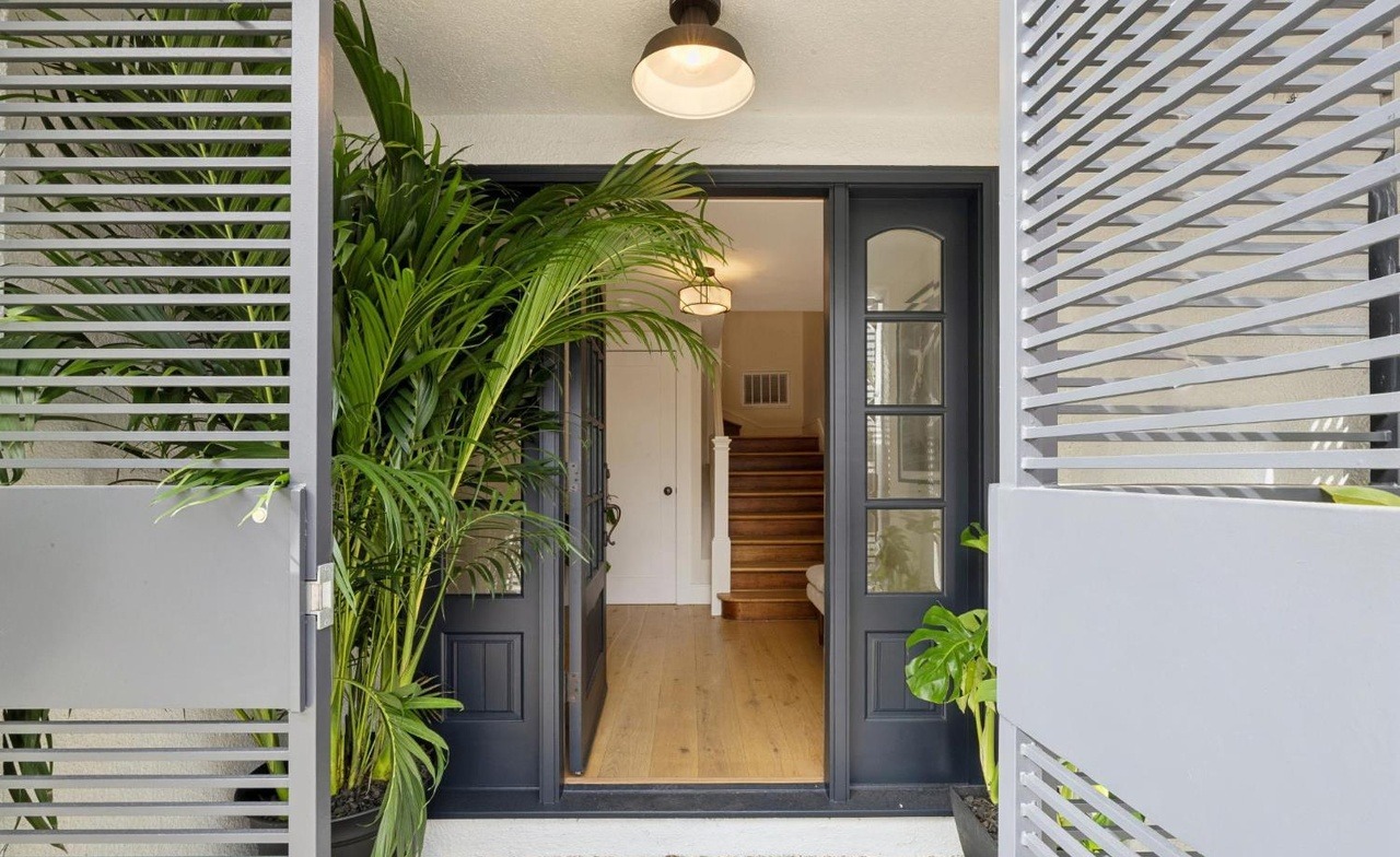 A meticulously designed entryway featuring a striking black-framed glass door and sidelights that create a dramatic entrance portal with white-painted architectural trim. The space balances minimalist sophistication with organic warmth through potted plants, slatted privacy screens, hardwood flooring, and crisp interior finishes, embodying a refined organic modern aesthetic.