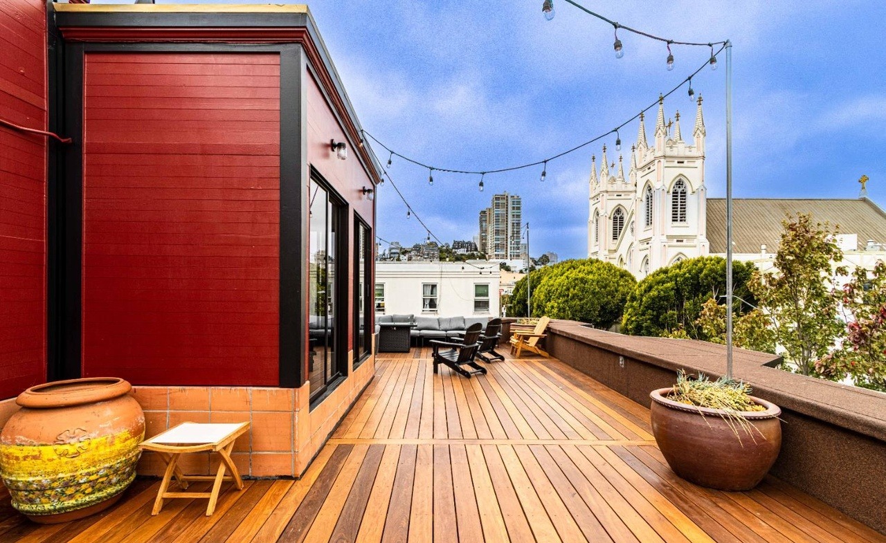 A sophisticated rooftop patio featuring warm-toned hardwood decking, a striking red modern structure, and curated plantings in terra cotta and brown ceramic vessels. The space balances contemporary design with organic materials, offering abundant natural light and framed views of a white church spire and urban skyline, creating an upscale outdoor living retreat.