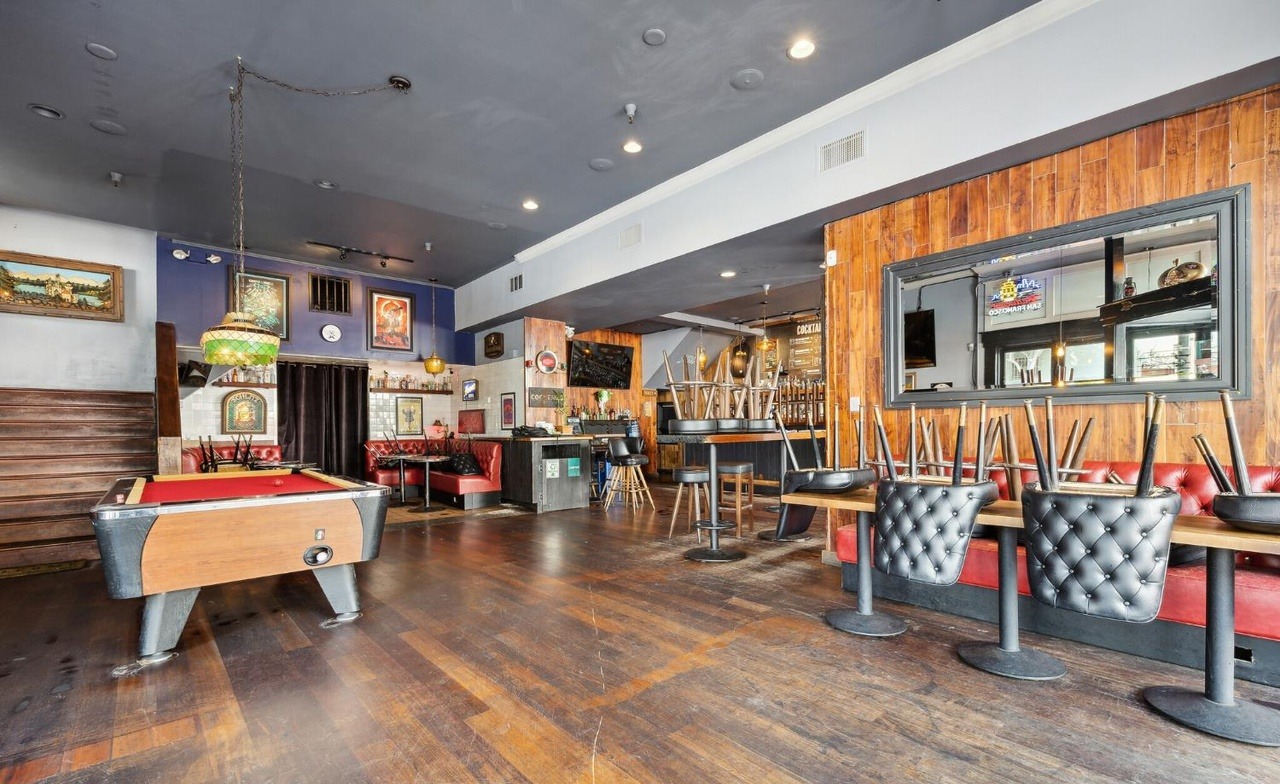 A sophisticated entertainment space blending industrial and glam aesthetics, featuring a pool table, bar counter, and custom shelving against warm wood-paneled walls. The room's sophisticated color palette of gray, orange, and red accents combined with upholstered seating and polished fixtures creates an inviting yet dramatic atmosphere for entertaining.
