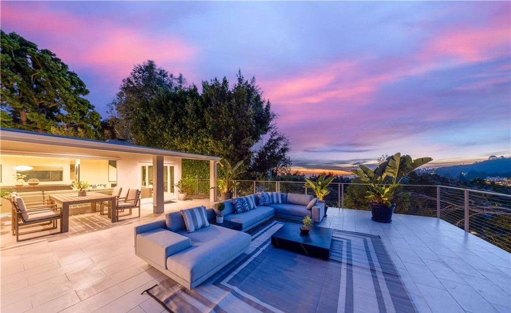 A breathtaking modern patio terrace overlooking mountain vistas, featuring sophisticated blue modular lounge seating with striped accents, expansive white porcelain tile flooring, and a seamless indoor-outdoor connection with illuminated interior spaces. The design exemplifies organic modern elegance with its clean lines, premium furnishings, and dramatic twilight lighting that transforms the space into an editorial showcase of contemporary luxury living.