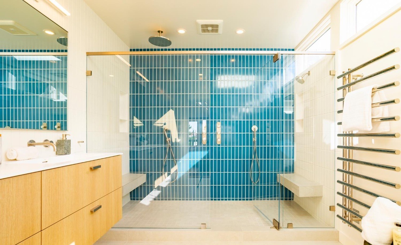 A sophisticated spa-like primary bathroom featuring a generous walk-in shower with dramatic vertical ribbed teal tile and frameless glass enclosure, paired with a natural wood floating vanity and brass fixtures. The cool-toned palette of white, cream, and teal creates a serene, airy atmosphere enhanced by abundant natural light and minimalist contemporary design.