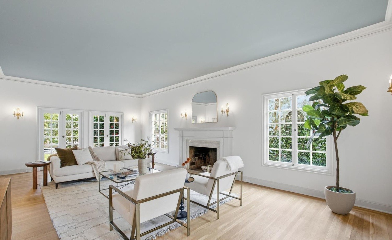 A serene, light-filled living room showcasing transitional elegance with traditional architectural details (crown molding, tray ceiling, fireplace) paired with contemporary furnishings in warm neutrals and soft greens. Multiple French doors and windows flood the space with natural light, while brass sconces and thoughtful material layering (hardwood, white painted trim, upholstered seating, potted greenery) create a sophisticated yet inviting atmosphere.