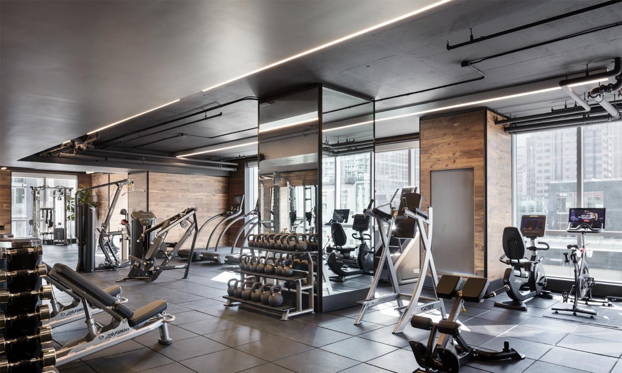 A high-end luxury gym featuring industrial-modern design with warm wood paneling, exposed structural elements, and linear ceiling lighting that creates a sophisticated, energetic atmosphere. The space showcases premium cardio and strength equipment, extensive windows overlooking a city skyline, and meticulous attention to material quality and spatial composition.