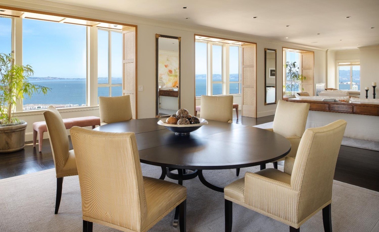 A stunning waterfront dining room with floor-to-ceiling windows showcasing panoramic ocean views, featuring a sculptural black round dining table surrounded by cream upholstered chairs. The space exemplifies sophisticated luxury through its minimalist restraint, refined material palette, and masterful use of natural light and architectural details.