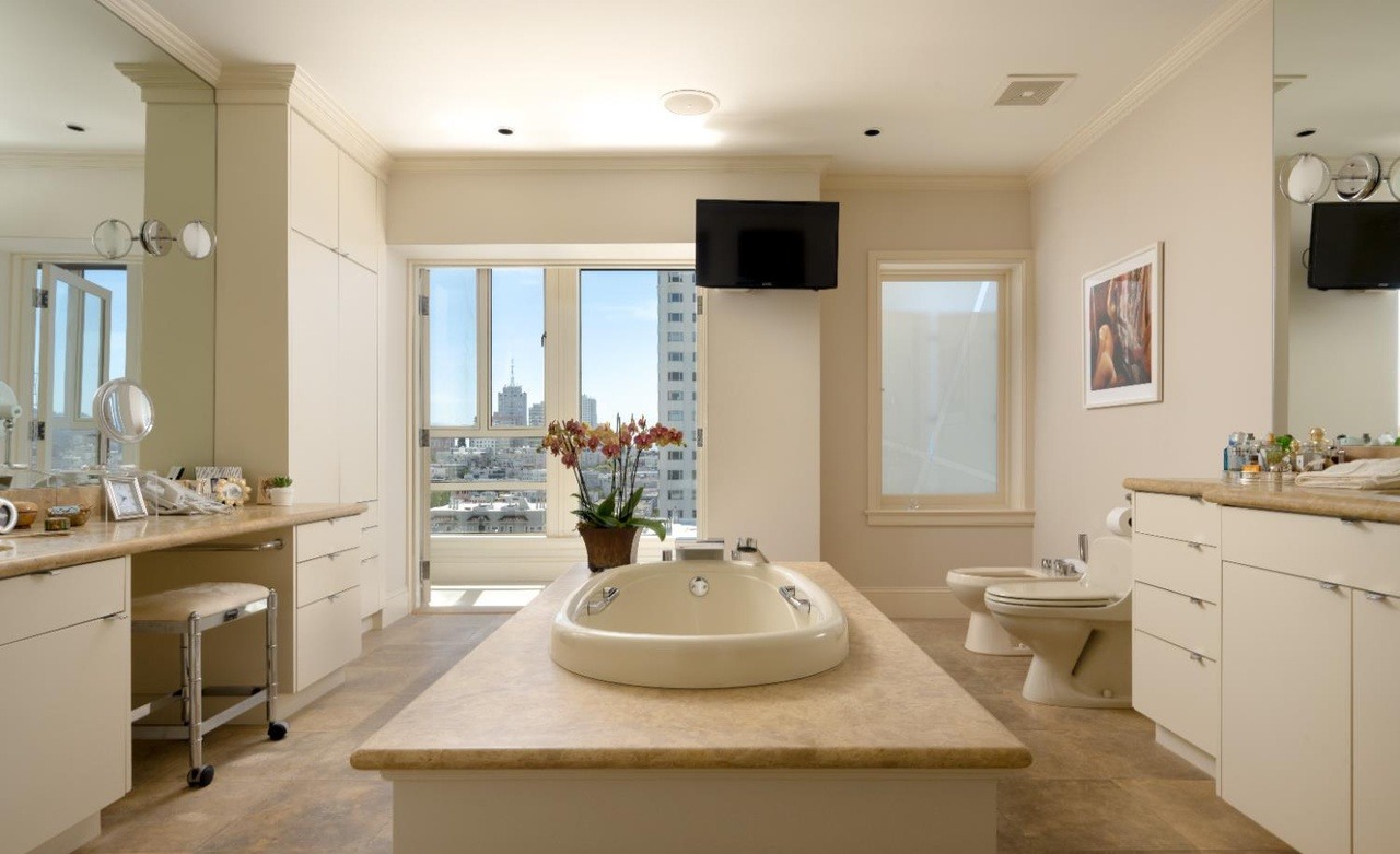 Freestanding Soaking TubDouble VanityFloor To Ceiling WindowsHigh CeilingsCrown MoldingStatement LightingRecessed LightingCustom MillworkCity ViewsDecorative Mirrors
