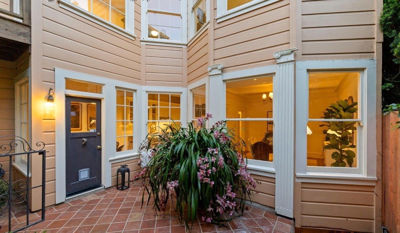 A sophisticated courtyard patio featuring classical architectural details—white columns with decorative capitals, cream and tan horizontal siding, and terra-cotta tile flooring—that create a refined East Coast aesthetic. Abundant natural light floods the space through floor-to-ceiling multi-pane windows, while lush hanging orchids and careful millwork details elevate this transitional luxury outdoor room.