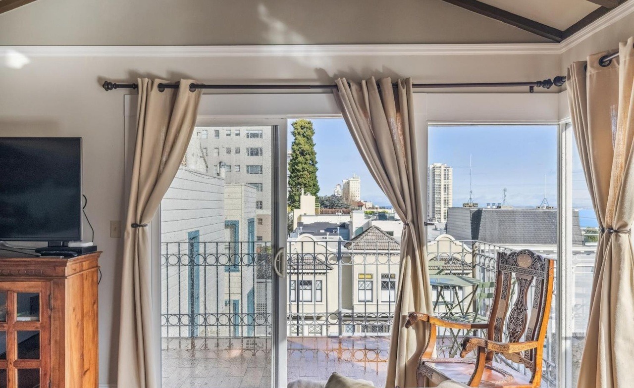 A sophisticated living room with abundant natural light from floor-to-ceiling windows overlooking an urban landscape, featuring a neutral cream and beige palette accented by warm wood furnishings and dark bronze hardware. The transitional design blends traditional architectural details like tray ceilings and crown molding with contemporary clean-lined furniture and layered textures, creating an airy yet luxurious atmosphere.