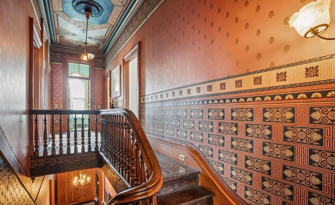 A stunning pre-war staircase featuring a coffered ceiling with celestial motifs, ornate patterned wallpaper in warm terracotta and gold tones, and hand-turned wooden balusters with brass hardware. The space exudes old-world elegance through layered traditional details, decorative wall panels, and carefully curated lighting, exemplifying haute European classical architecture with meticulous restoration.