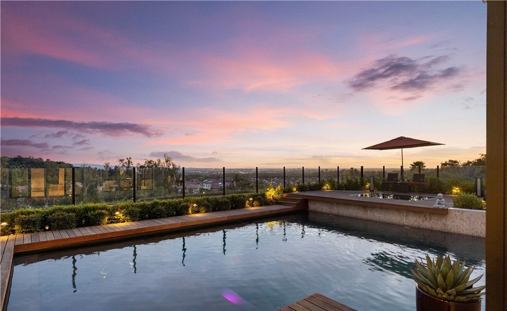 A stunning rooftop infinity-edge pool at dusk showcases sophisticated desert modern luxury with a seamless blend of concrete pool edge, wooden decking, and floor-to-ceiling glass railings offering panoramic valley views. The warm twilight palette, integrated landscape lighting, and minimalist furnishings create a serene yet grand outdoor sanctuary that epitomizes contemporary high-desert resort living.