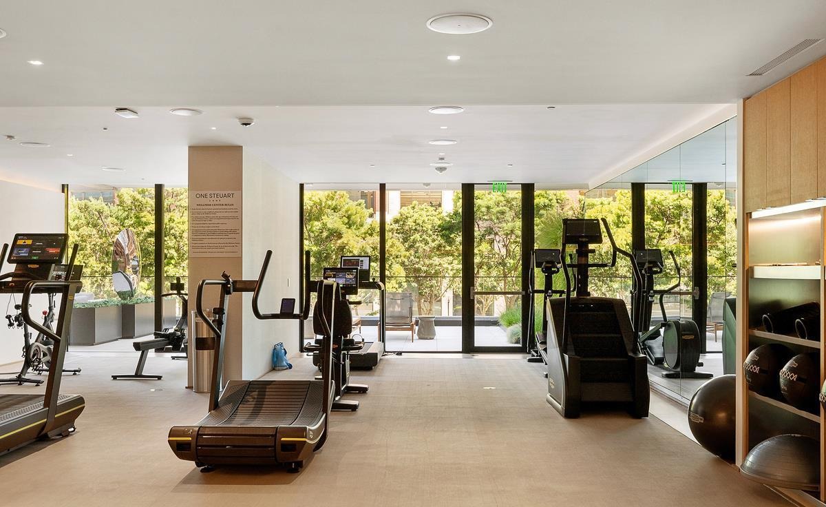 A sophisticated, light-filled fitness facility with floor-to-ceiling windows overlooking lush landscaping, combining minimalist design with organic modern warmth through natural wood accents and neutral concrete flooring. The space balances functionality with refined aesthetics through recessed lighting, mirrored walls, and strategically curated black cardio and strength equipment arranged in an open, airy layout.