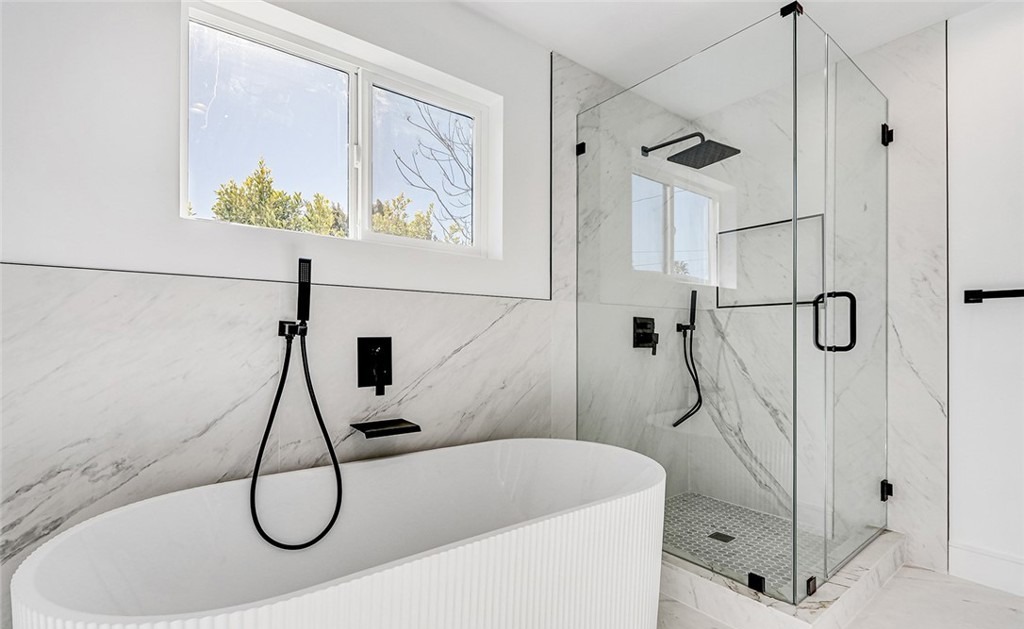 A stunning contemporary primary bathroom featuring a sculptural white freestanding soaking tub paired with a sleek frameless glass walk-in shower, all clad in luxurious marble with veining detail and oversized large-format tiles. The space exemplifies minimalist luxury with black matte hardware accents, abundant natural light from a large window, and a serene monochromatic palette that creates a spa-like atmosphere.
