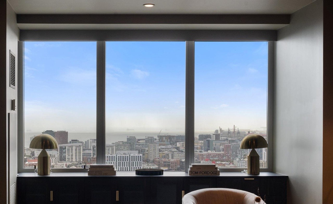 A sophisticated high-rise home office featuring expansive floor-to-ceiling windows commanding breathtaking panoramic city views. The minimalist aesthetic is anchored by sleek black cabinetry and brass dome pendant lights, creating a contemporary luxury workspace that prioritizes natural light and refined restraint.