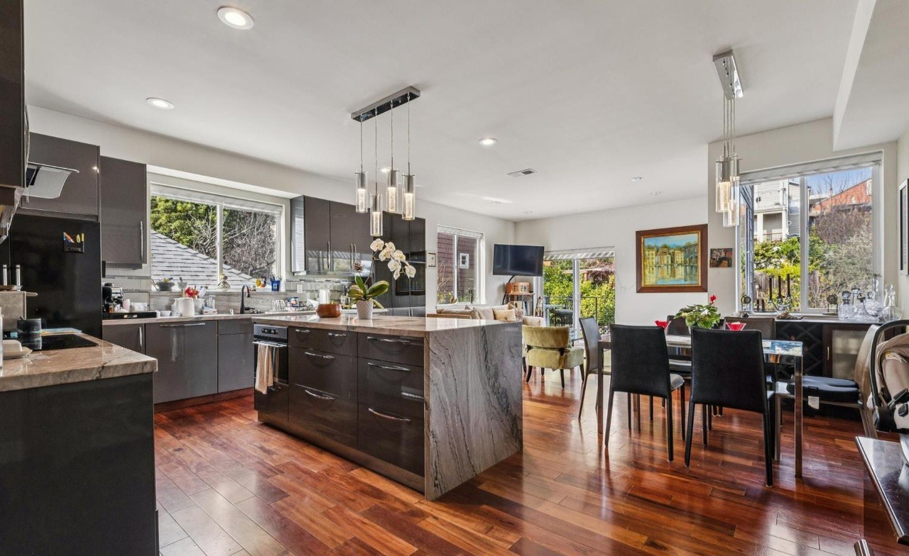 A sophisticated open-concept kitchen featuring black flat-panel cabinetry with a dramatic marble waterfall island, rich hardwood flooring, and abundant natural light from expansive windows. The space balances contemporary clean lines with warm materials and transitional crown molding, creating a luxurious yet inviting culinary environment with statement pendant lighting and seamless integration into the adjoining dining and living areas.
