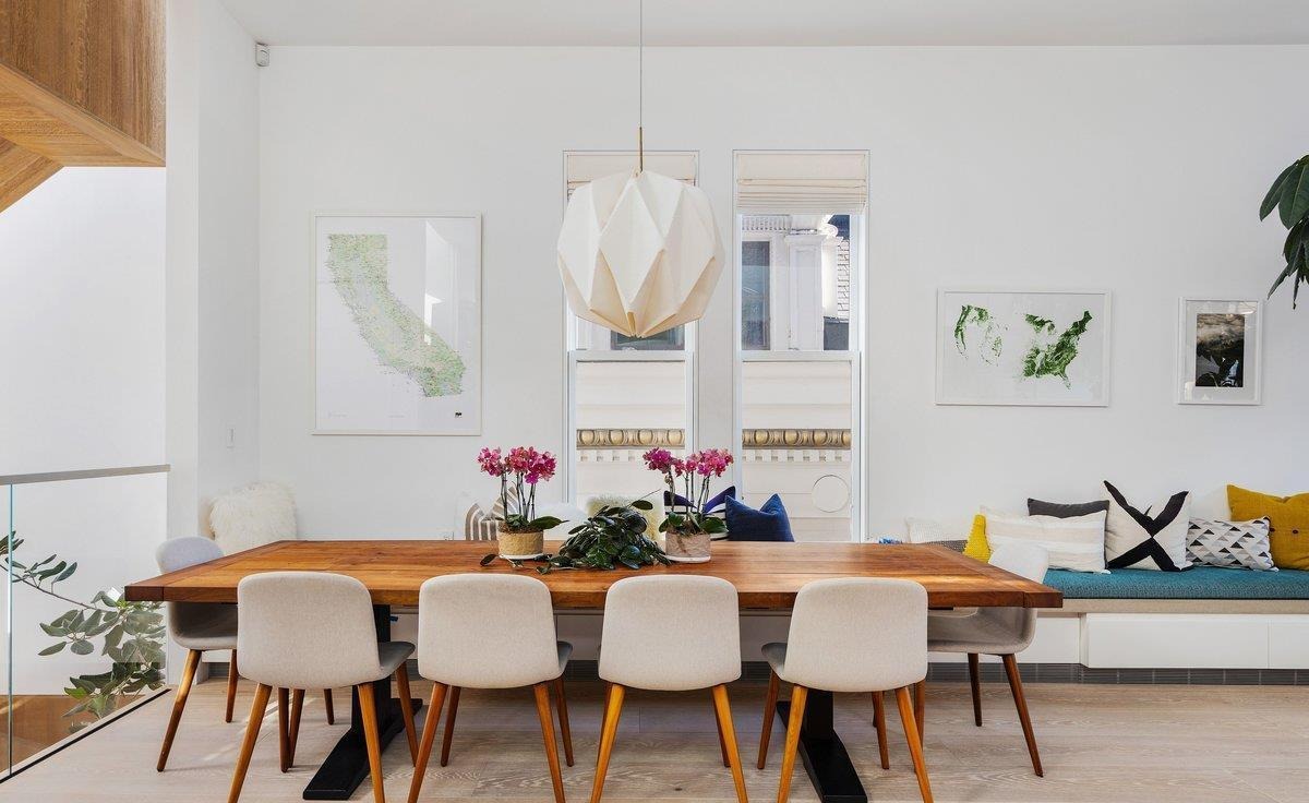 A sophisticated open-concept dining room featuring a striking walnut dining table with creamy linen mid-century-inspired chairs, anchored by a sculptural geometric pendant light in cream and natural wood. The serene, light-filled space balances minimalist aesthetics with warm organic materials, punctuated by thoughtfully placed botanical elements and colorful accent pillows on a built-in banquette that evokes casual luxury.