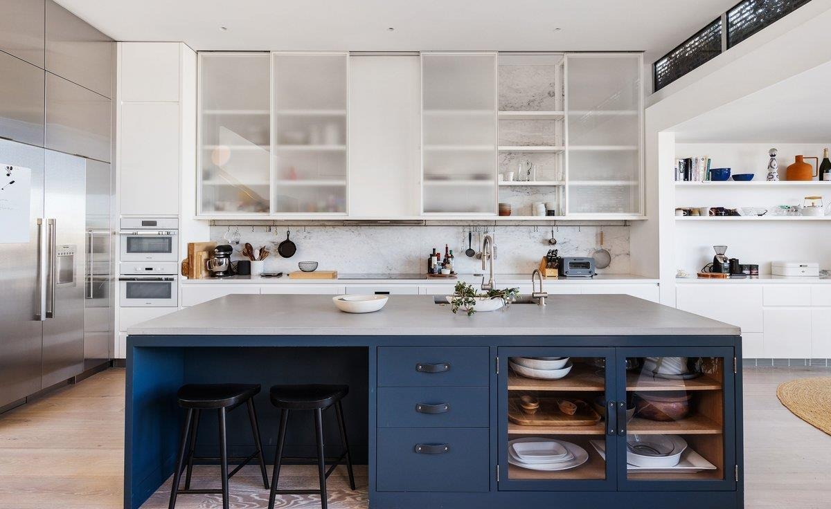 A sophisticated, light-filled kitchen featuring a striking two-tone color scheme with navy blue lower cabinetry and crisp white uppers, anchored by a dramatic waterfall-edge island with seating. The design balances contemporary clean lines with warm materials like brass hardware and natural wood flooring, creating a transitional aesthetic that feels both current and timeless.