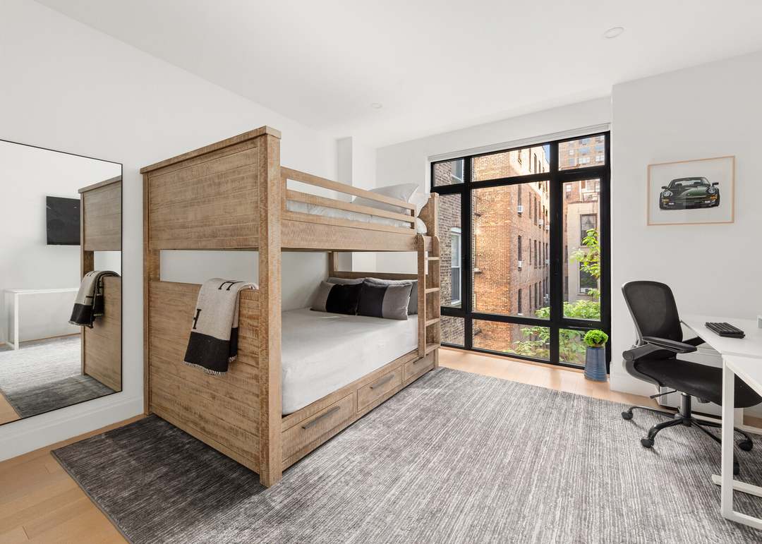 A sophisticated guest bedroom featuring a custom natural wood bunk bed with crisp white linens, anchored by abundant natural light from oversized black-framed industrial windows overlooking brick buildings. The neutral palette of warm wood, white walls, and gray carpet creates a serene, sophisticated retreat with a modern desk workspace, balanced by traditional millwork and clean-lined contemporary furnishings.