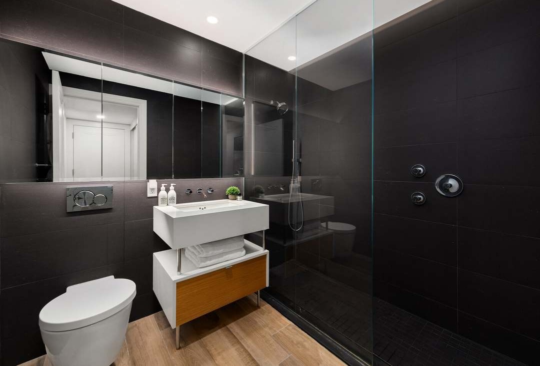 Countertop: QuartzCabinets: FloatingCabinet Color: Warm WoodFlooring: HardwoodCeiling: StandardVanity: Floating Wood Base White TopShower: Frameless Glass Walk InTile: Large Format