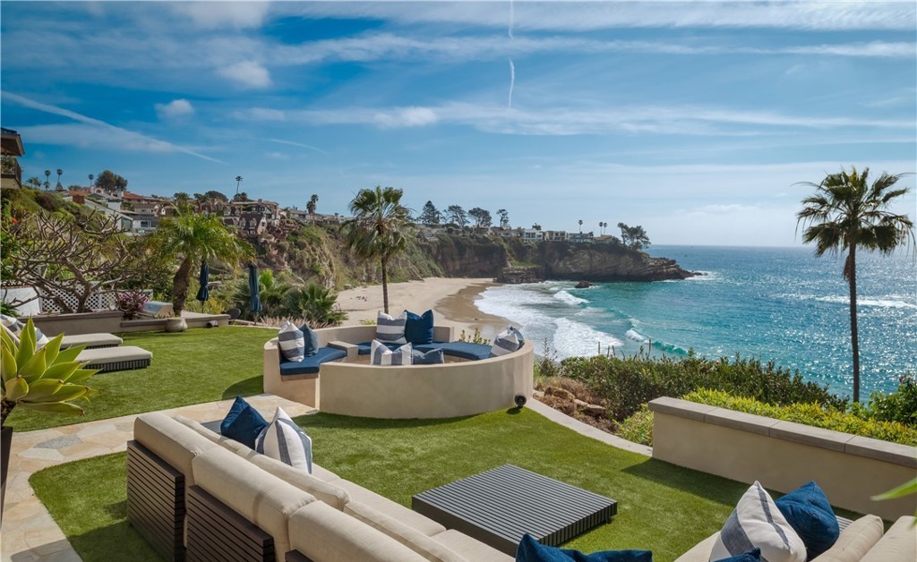 An ultra-luxury coastal patio perched on a dramatic oceanside cliff, featuring a sculptural curved fire pit with navy cushioning, manicured lawn, and unobstructed panoramic ocean views. The space seamlessly blends organic modern design with sophisticated coastal aesthetics, combining natural materials and clean lines with a serene, resort-like atmosphere.