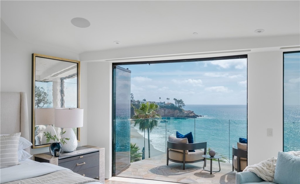 A stunning oceanfront primary bedroom suite featuring expansive floor-to-ceiling glass doors opening onto a private balcony overlooking turquoise waters and rocky coastal cliffs. The serene, minimalist aesthetic is anchored by soft neutral tones, natural stone flooring, and carefully curated modern furnishings with blue accent pillows, creating a sophisticated sanctuary that seamlessly blends indoor luxury with dramatic coastal vistas.