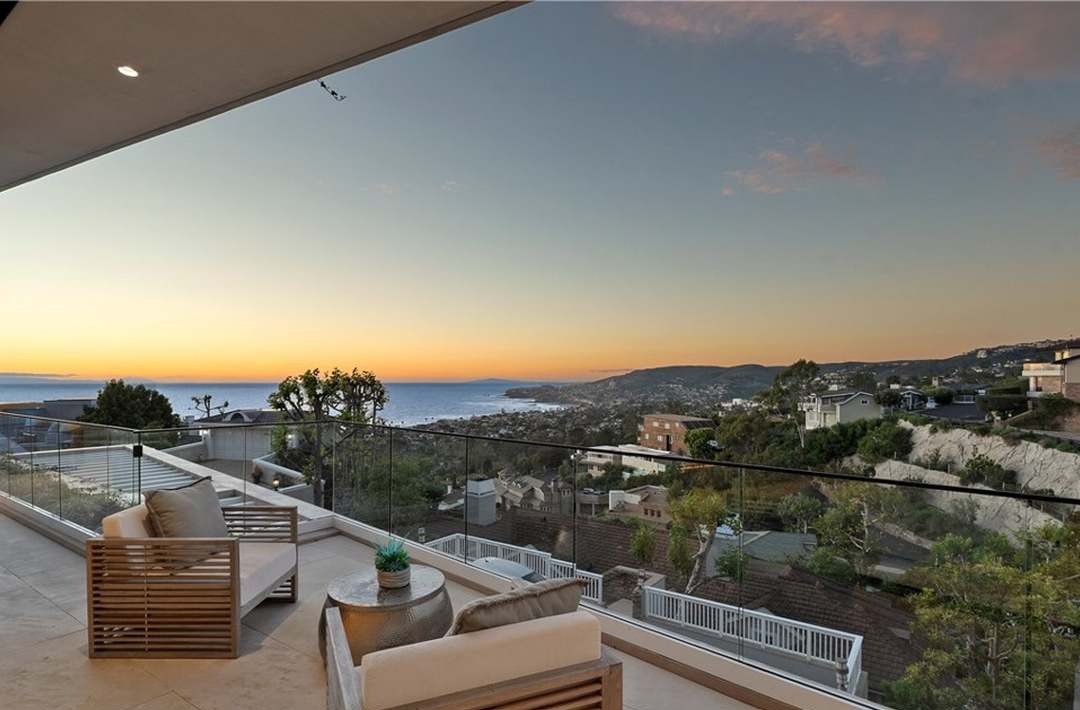 A breathtaking elevated terrace patio overlooking a coastal valley at golden hour, featuring minimalist teak lounge furniture with neutral cushioning, smooth stone flooring, and seamless views of the ocean and hillside development below. The design exemplifies organic modern luxury with its emphasis on natural materials, unobstructed sightlines, and effortless California sophistication.