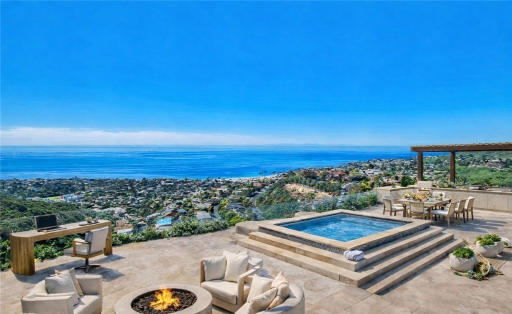 A stunning ultra-luxury coastal entertainment terrace overlooking the Pacific Ocean, featuring a resort-style infinity pool, circular fire pit with built-in seating, and sophisticated desert-modern aesthetic with warm concrete decking and natural wood pergola. The space seamlessly blends indoor-outdoor living with commanding ocean views, premium outdoor furnishings, and a multi-functional design that epitomizes contemporary Southern California luxury.