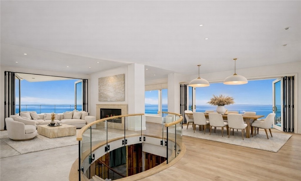 A stunning open-concept family and dining area showcasing floor-to-ceiling ocean views framed by expansive multi-pane glass doors, anchored by a modern fireplace and furnished with curved cream seating and a natural wood dining table. The space epitomizes contemporary coastal luxury with warm hardwood flooring, neutral palette, brass fixtures, and abundant natural light that creates an airy, sophisticated atmosphere.