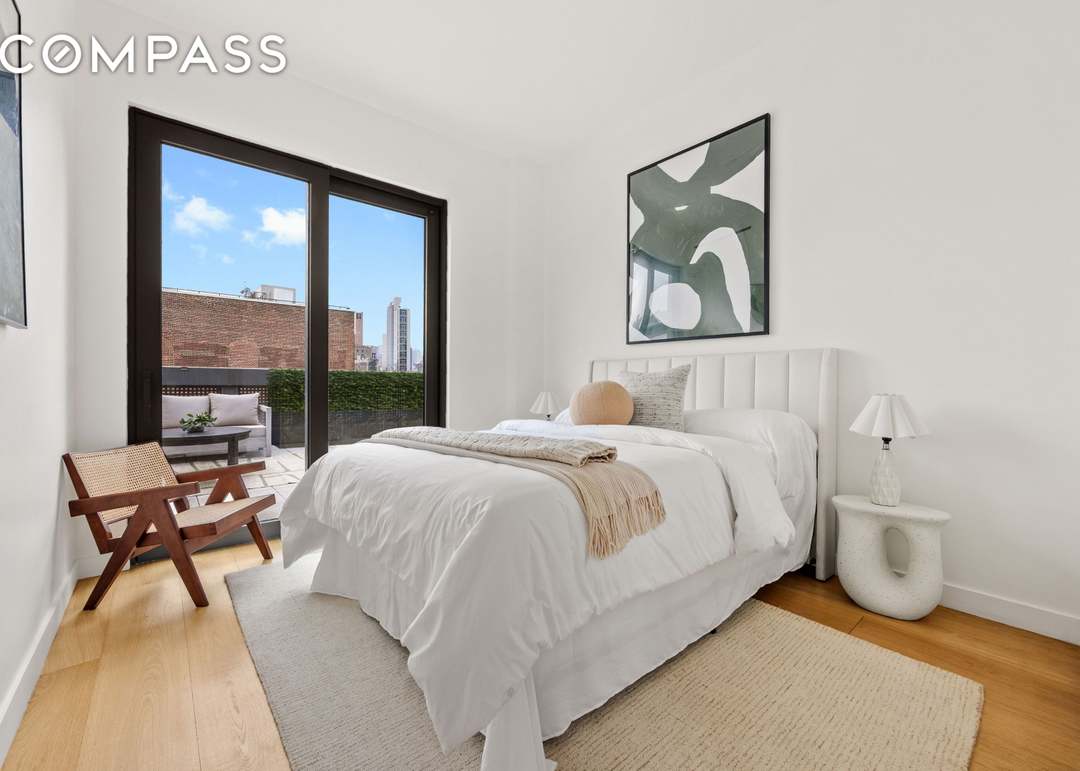 A serene primary bedroom with expansive floor-to-ceiling windows offering urban views and abundant natural light, featuring a minimalist white upholstered bed, warm wood accents, and carefully curated furnishings that balance organic warmth with contemporary restraint. The design epitomizes luxury through intentional simplicity: layered neutral tones, quality natural materials, and an adjoining private patio create a sophisticated urban sanctuary.