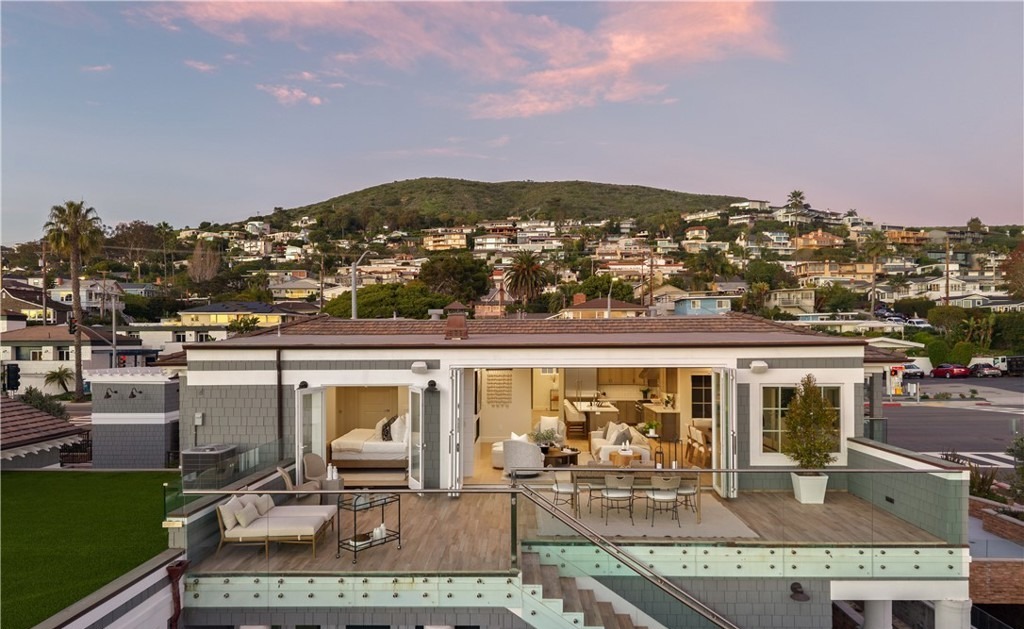A stunning contemporary patio seamlessly integrated with the residence, featuring floor-to-ceiling glass walls that dissolve the boundary between indoor and outdoor living. The space showcases warm modern furnishings in cream and soft greens, composite decking, and glass railings with black hardware, creating an airy, sophisticated retreat overlooking a hillside neighborhood with abundant natural light and refined coastal-modern aesthetics.