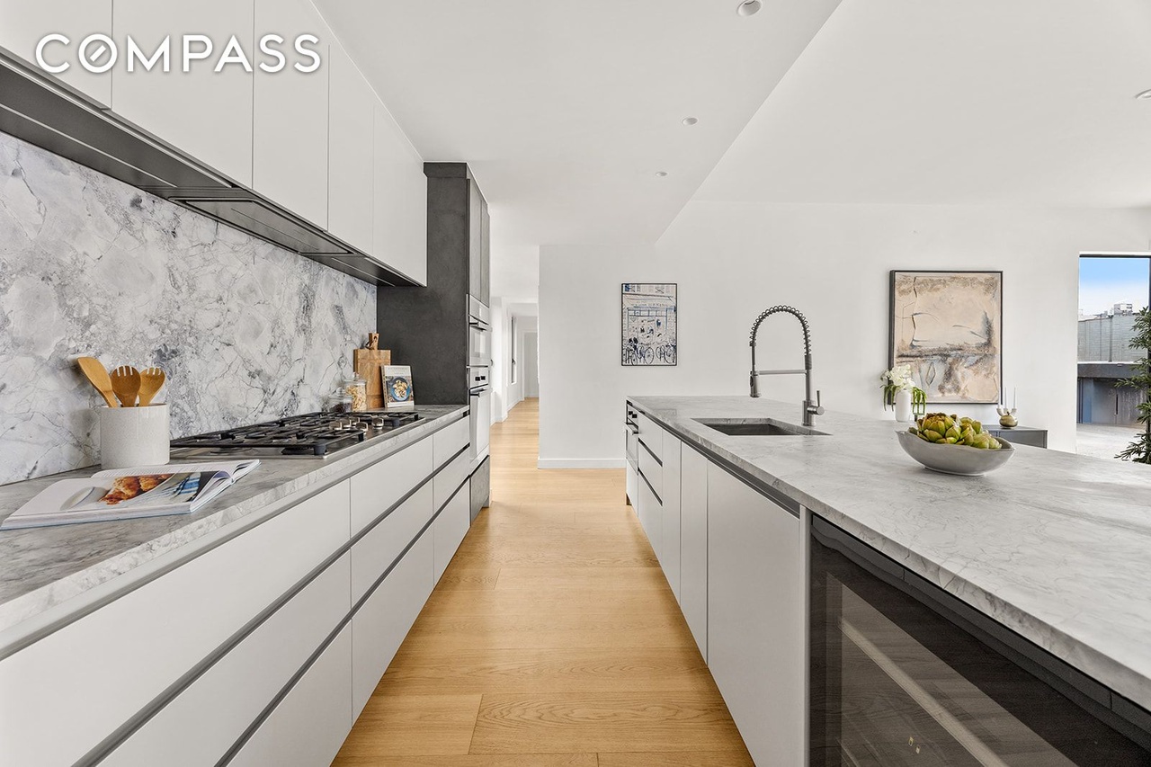 Countertop: MarbleCabinets: Flat PanelCabinet Color: WhiteFlooring: HardwoodBacksplash: Stone SlabCeiling: Standard